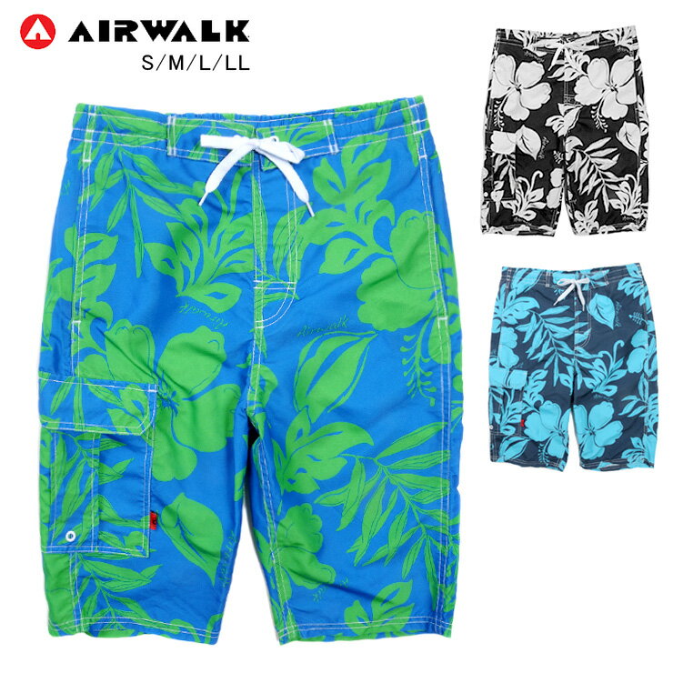 大きいサイズあり ブランド水着AIR WALK メンズ用サーフパンツ エアウォーク 815302 男性用 海パン 海水パンツ トランクス ハイビスカス フラワー柄 花柄 マジックテープ付きポケット ブラック ネイビー ブルー S M L LL メール便送料無料