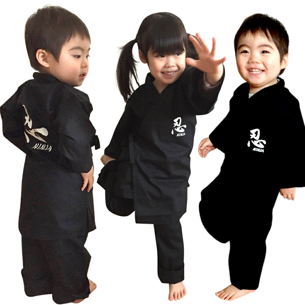 忍者服(忍者コスチューム) ジャケット・パンツ・忍者頭巾の3点セット サイズ90 適応身長80cm 〜100cm 身丈45cm 身幅27cm ズボン丈51cm サイズ110 適応身長100cm 〜120cm 身丈54cm 身幅32cm ズボン丈63cm サイズ130 適応身長120cm 〜140cm 身丈63cm 身幅42cm ズボン丈72cm サイズ150 適応身長140cm 〜160cm 身丈72cm 身幅53cm ズボン丈90cm 男女兼用 素材 綿100% 忍者スーツと子供甚平の エピソード 「オーストラリアから可愛い忍者と甚平少女 登場」 オーストラリアから家族旅行のお客様が京都シルクのお店に来店。