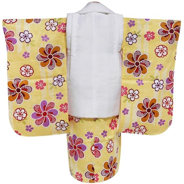 色 白系 イエロー系 特徴 ポリエステルのちりめん素材を使った三歳用被布・コートセットです。